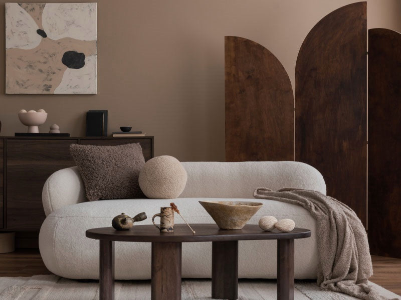 Sofá de 3 plazas tapizado en tela color beige con diseño acolchado