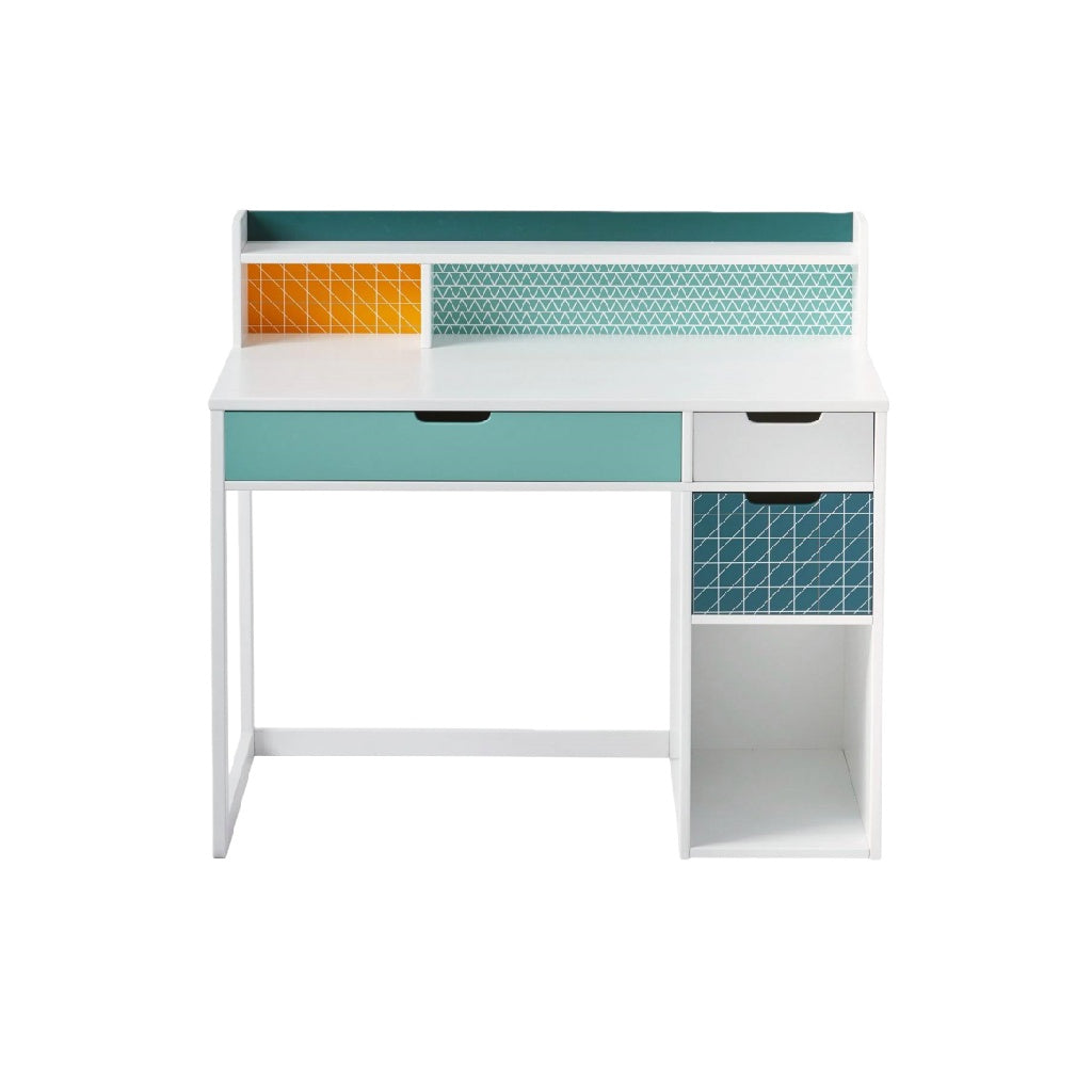 Escritorio de oficina blanco con cajones y estante superior, diseño juvenil
